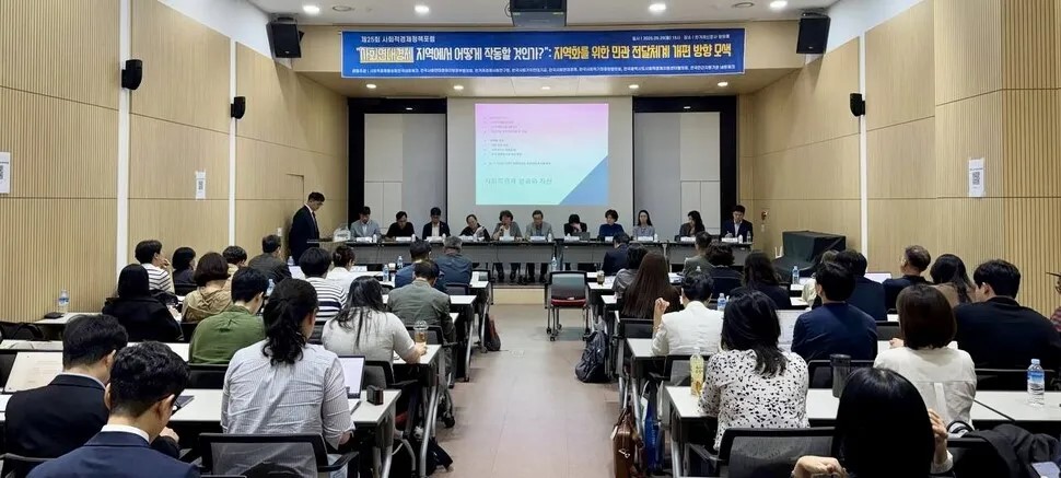 “지난 윤석열 정부 시기 사회적경제를 사회주의 경제로 생각해 예산을 전액 삭감했다. 그럼에도 지역사회에 기반한 사회적경제 주체가 꿋꿋이 버텨줬다.” 더불어민주당 위성곤 의원은 지난 9월29일 서울 마포구 공덕동 한겨레신문사 청암홀에서 열린 제25회 사회적경제 정책포럼 축사에서 지난 2년을 이렇게 평가했다. 사회적기업 신규 인증은 2022년 428개에서 2024년 236개로 급감했고, 인증 취소·반납은 111개에서 205개로 증가했다.